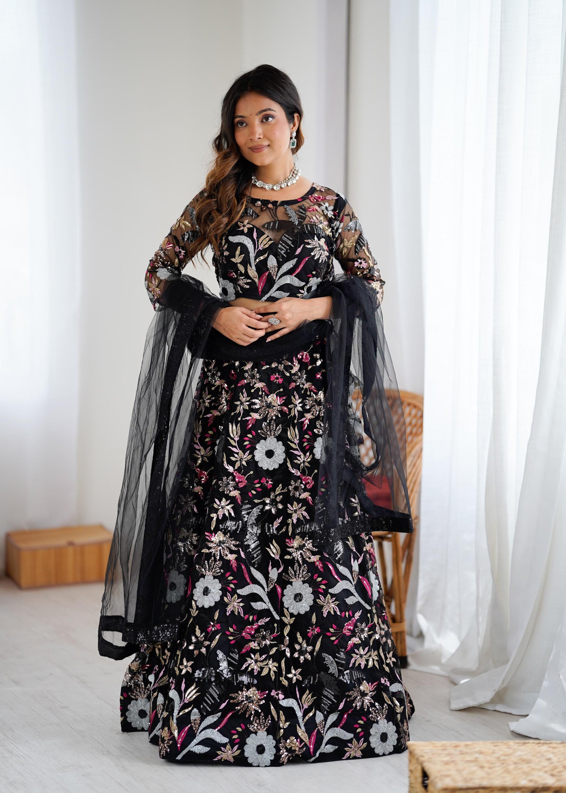 Step into timeless elegance with this luxurious Butterfly Net Lehenga Choli, designed for brides and fashion lovers who want to stand out. The lehenga is richly adorned with intricate thread embroidery and dazzling four-sequins detailing, giving it a glamorous sparkle from every angle.
