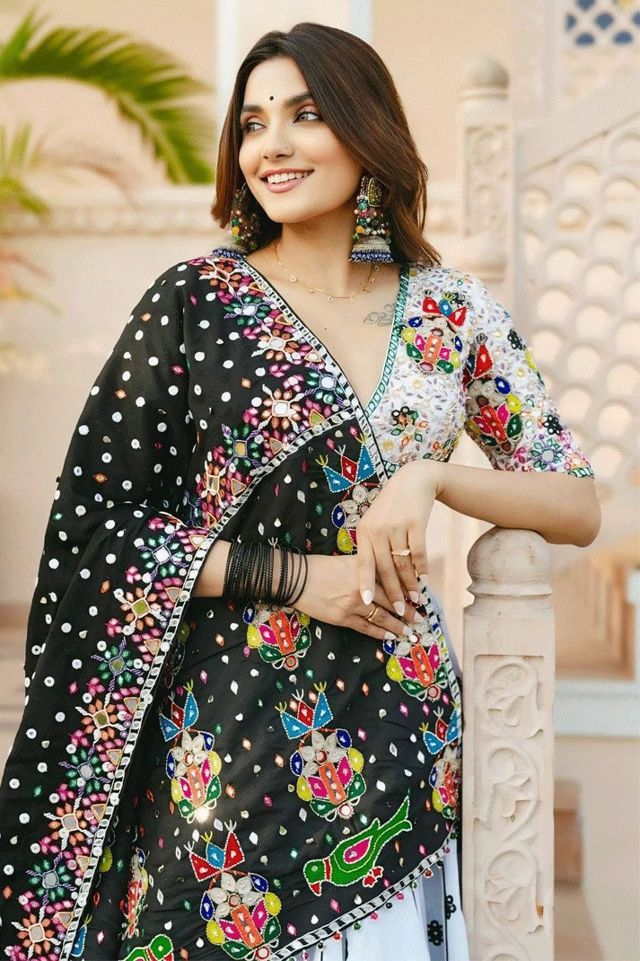 Discover the stunning Prachi Solanki Gamthi Work Designer White Lehenga Choli from Anaya Designer Studio, featuring heavy butter silk fabric, real mirror work, and intricate Gota Patti designs. Perfect for Navratri celebrations, this fully stitched lehenga offers a 4-meter flair and an elegant look.