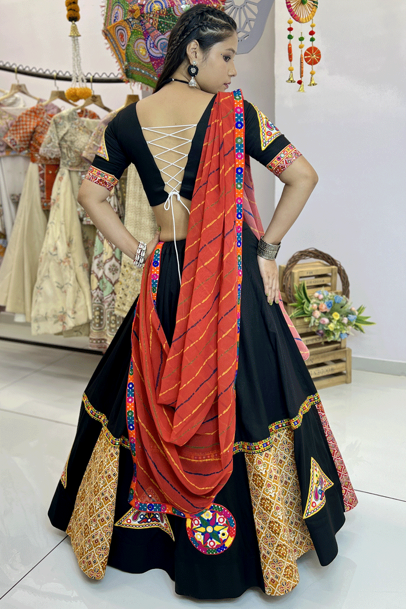 Traditional Gujaratri Black Lehenga For Special Navratri Outfit in Embroidery Thread Work Lace, Real Mirror Patch Work