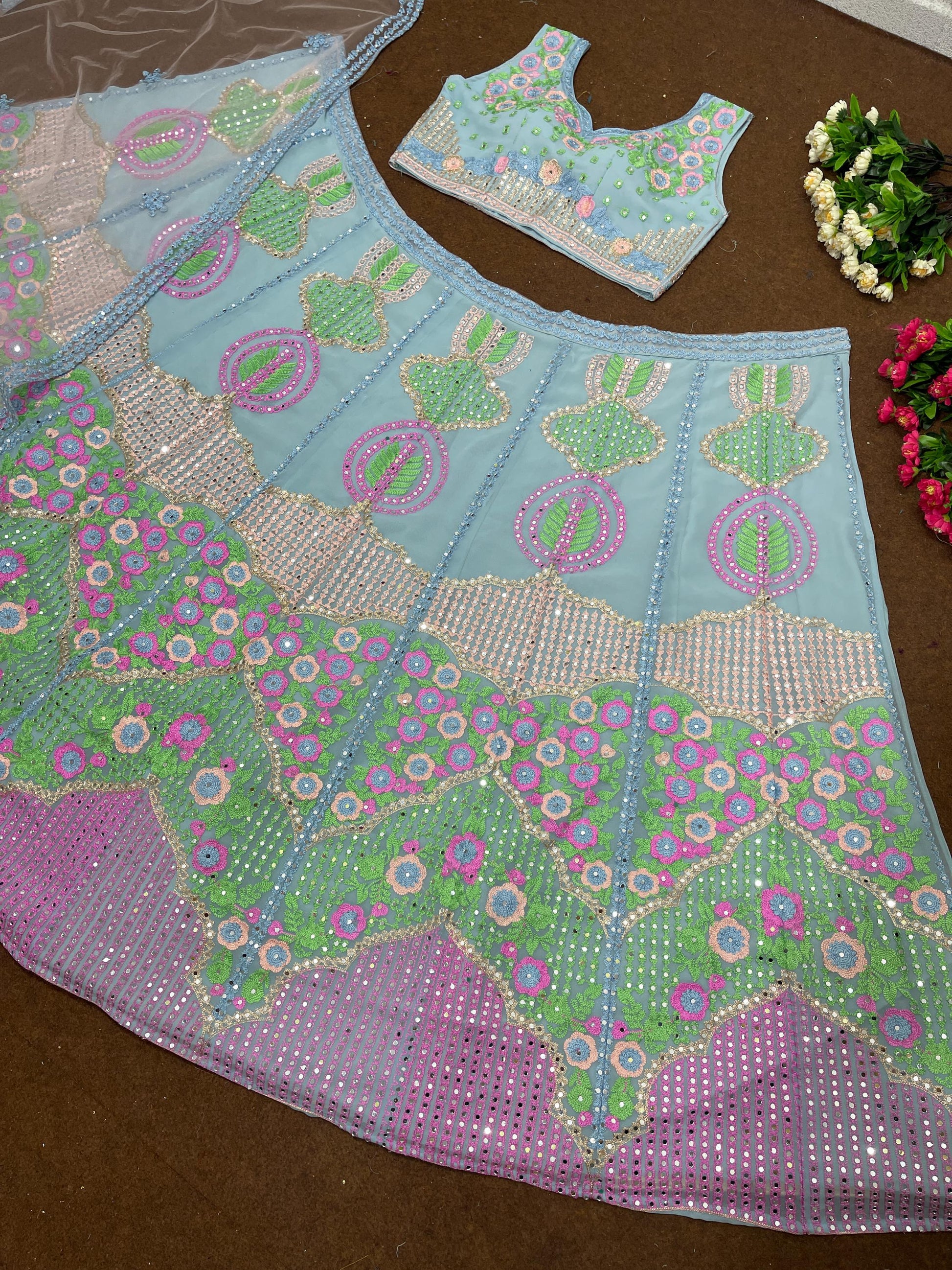 Lehenga: Faux Georgette with heavy chine sequins embroidery & real mirror work, enhanced with 3-meter flair, canvas, and can-can support.